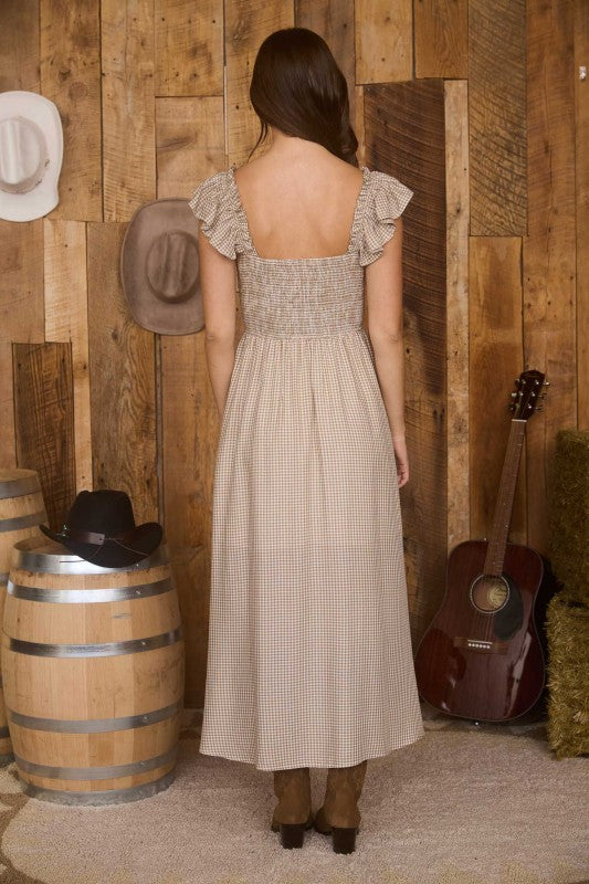 SQUARE NECKLINE with SHORT RUFFLE SLEEVES and SMOCKED BODICE FRONT BOW DETAIL and A-LINE SILHOUETTE PLAID PATTERN MIDI DRESS