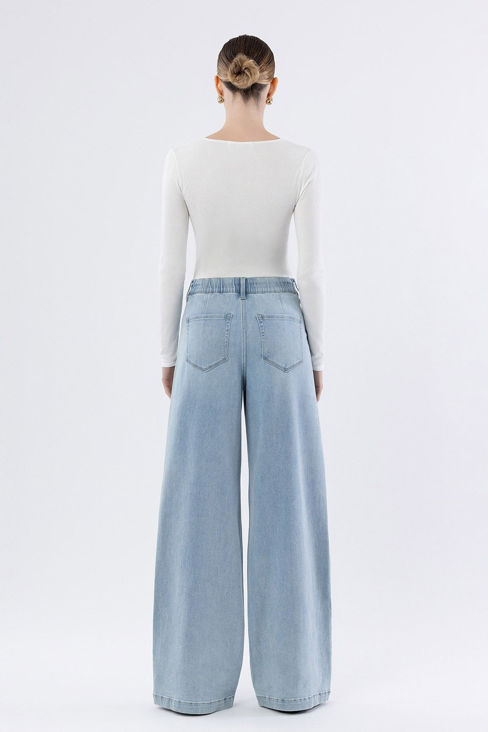 SUPER HIGH RISE DRAWCORD ELASTIC WB WIDE LEG JEANS COMFORT STRETCH DENIM, SUPER HIGH RISE WAIST, DRAWCORD ELASTIC WAISTBAND, FINISHED HEM, FULL LENGTH, PLEATED WIDE LEG JEANS