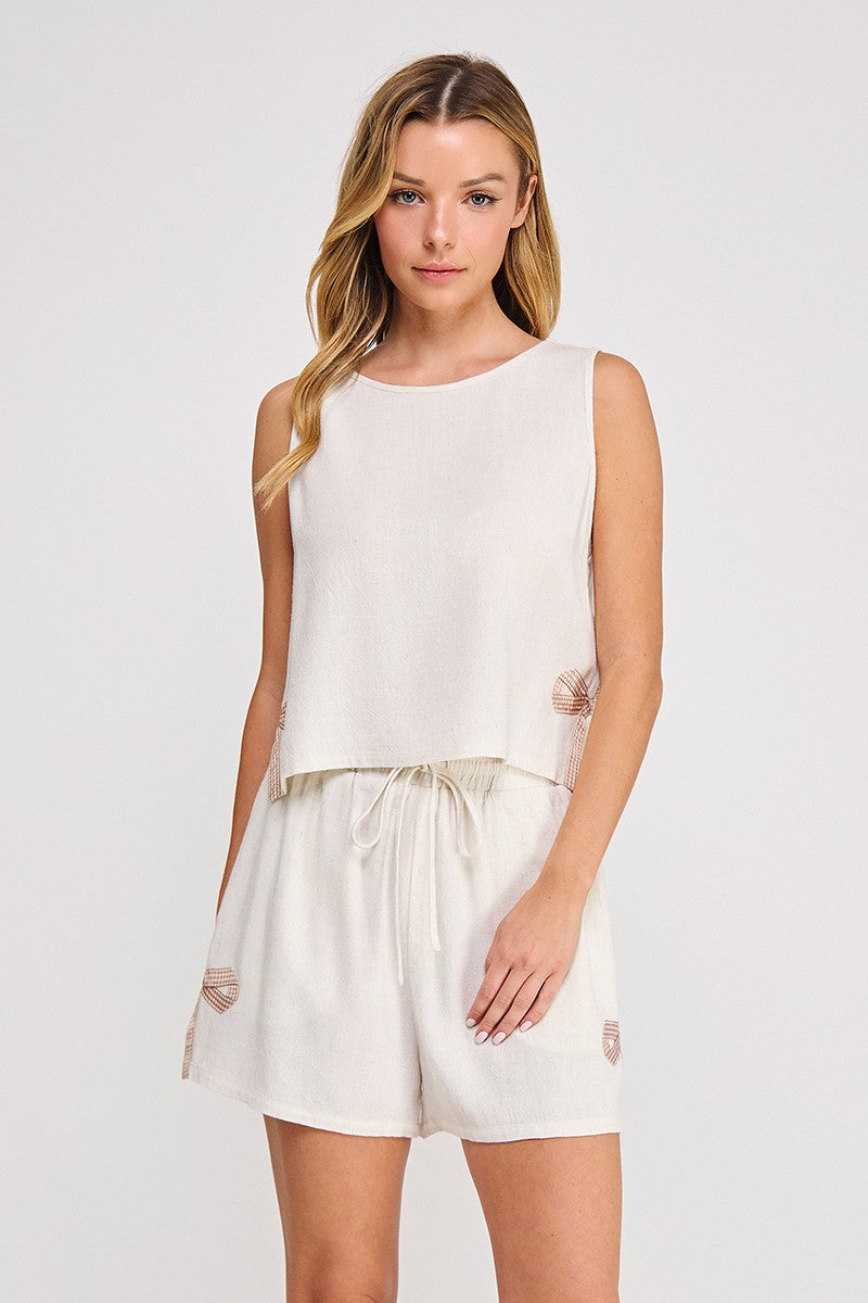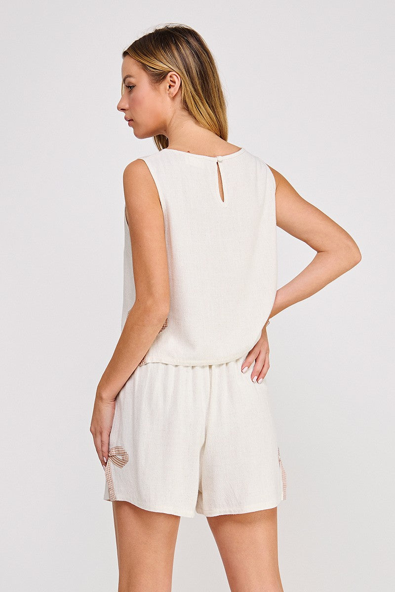 Soft linen blend tank with gingham bow side hem applique,