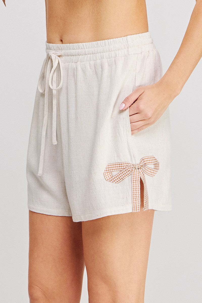 Soft linen blend elastic tie waist shorts with side hem bow applique